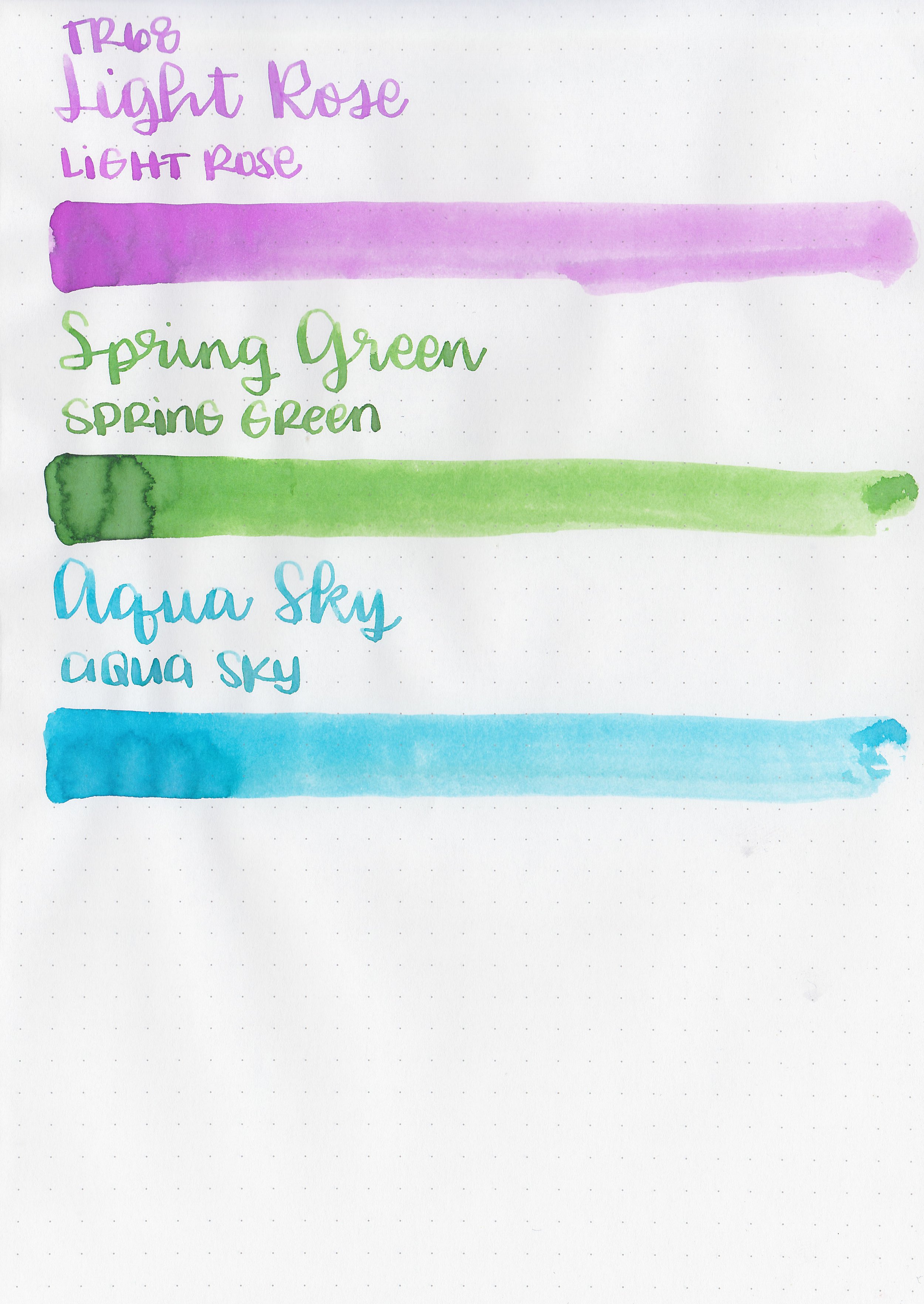 Left to right: Light Rose, Spring Green and Aqua Sky.
