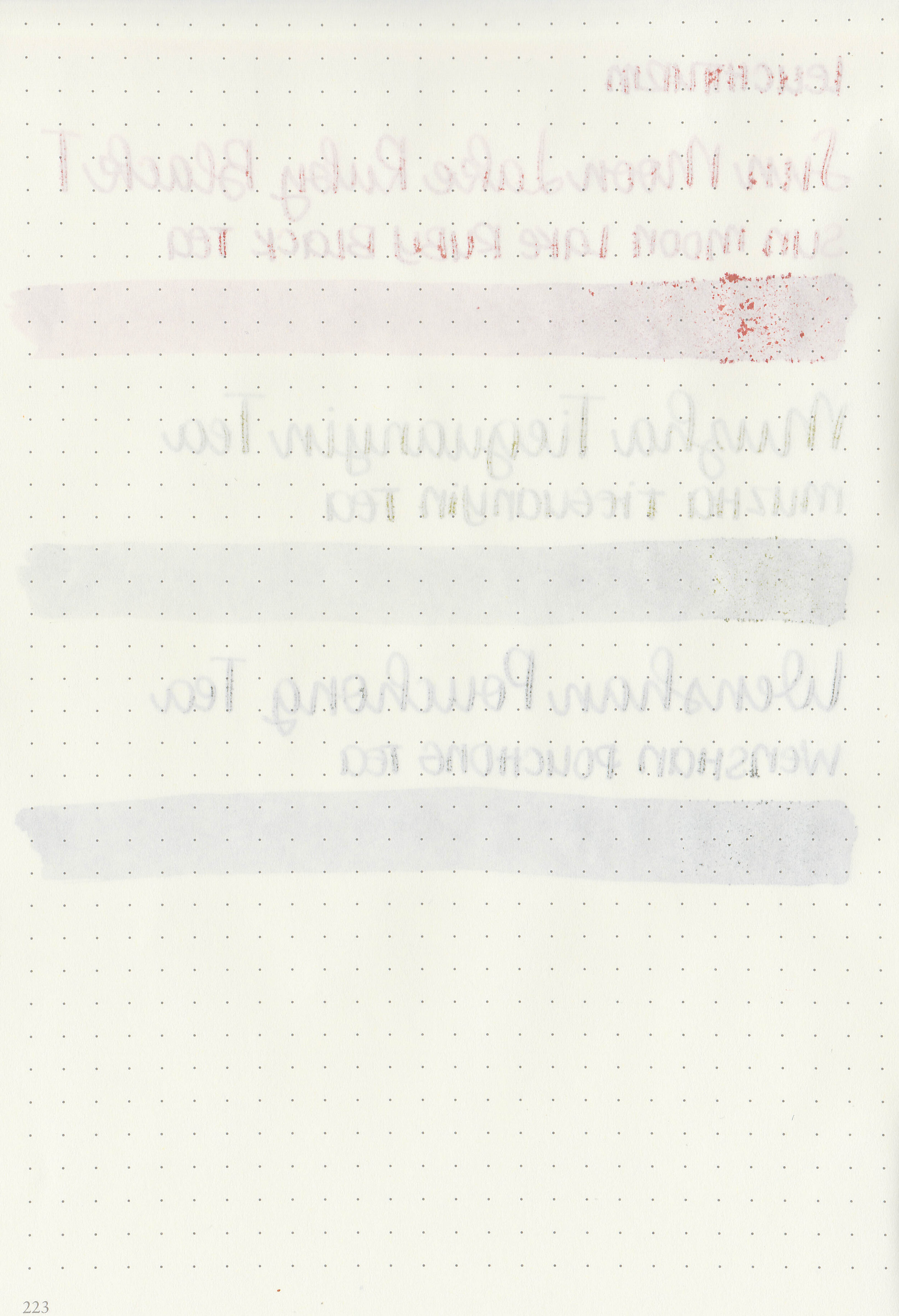 I used a Taroko Enigma notebook. All three inks had a wet and watery flow. I did have some flow issues with Muzha, it gushed ink at the beginning.
