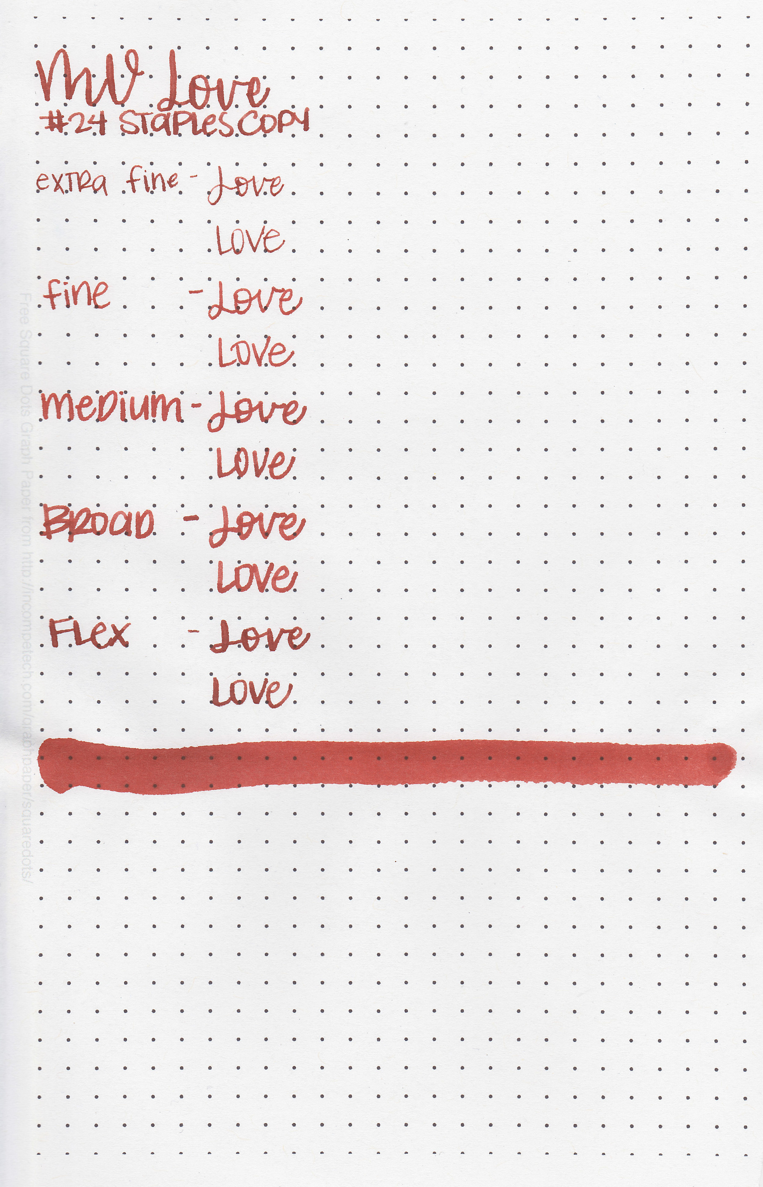 On Staples 24 lb copy paper there was a bit of bleeding and feathering in the flex nib as well as some feathering in the other nib sizes.