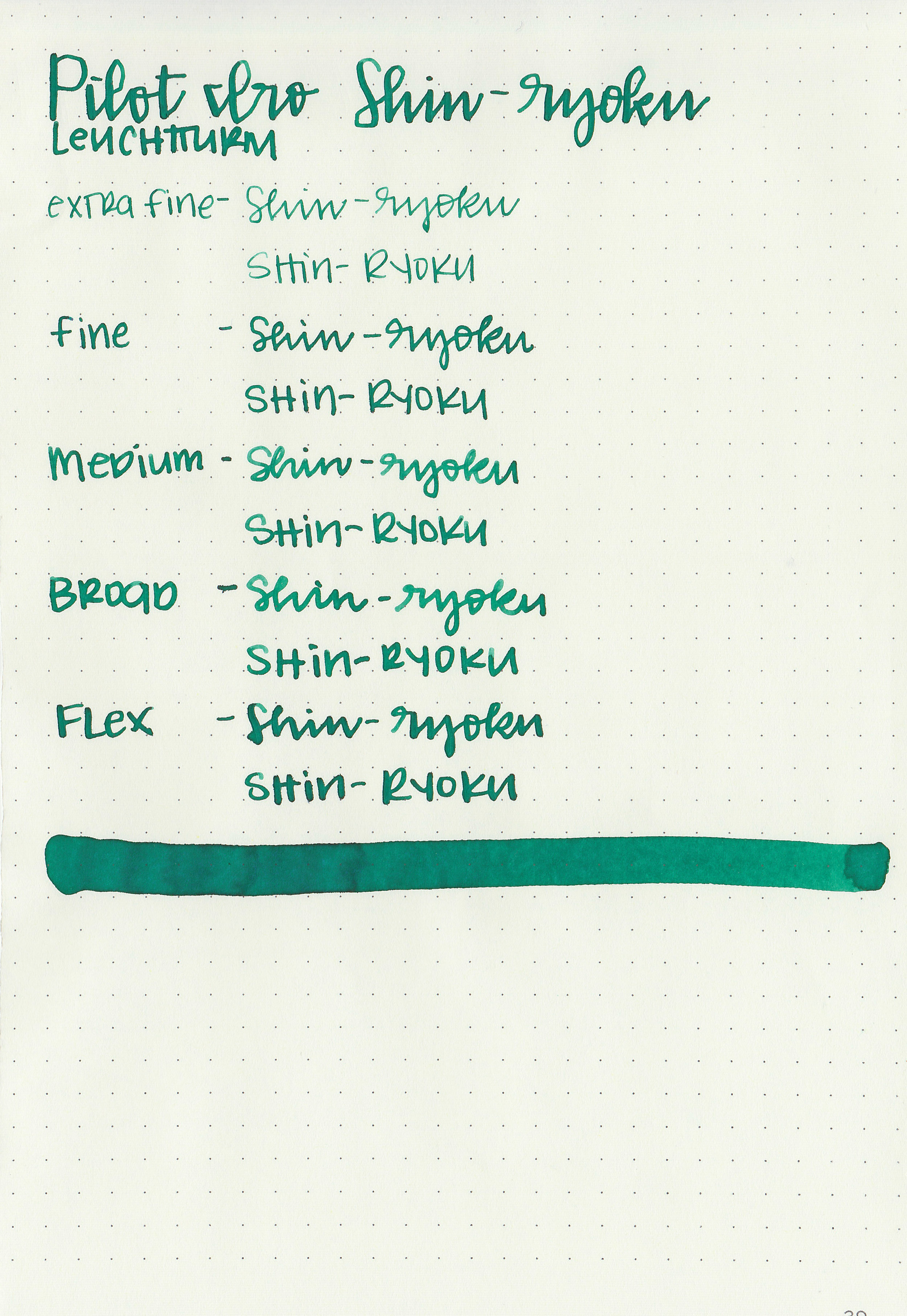 Shin-ryoku is similar to Montblanc Irish Green. Click here to see the green inks together, and click here to see the Pilot inks together.