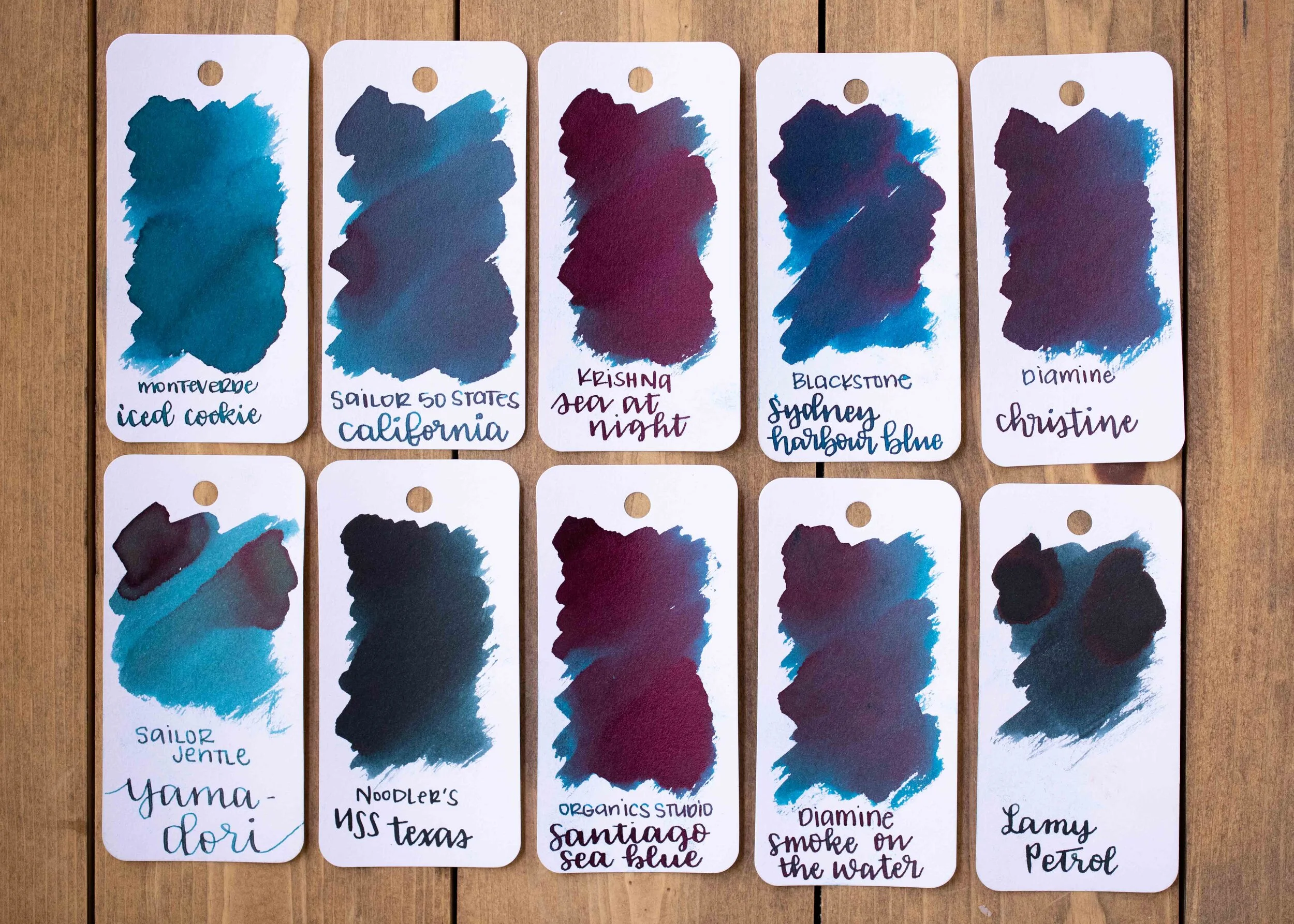 California is closest to Diamine Smoke on the Water. Click here to see the Sailor inks together, and click here to see the teal inks together.